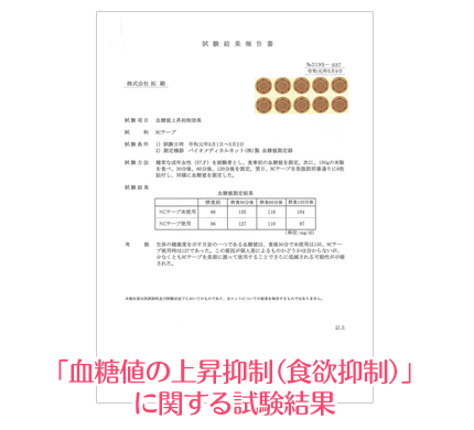 ダイエットを成功へ導く為に、独自で開発したNCテープは、第三者機関によりダイエットに効果があると証明されました。食欲を抑え、さらに代謝を上げる効果があるので、ダイエット中の強い見方となってくれます。