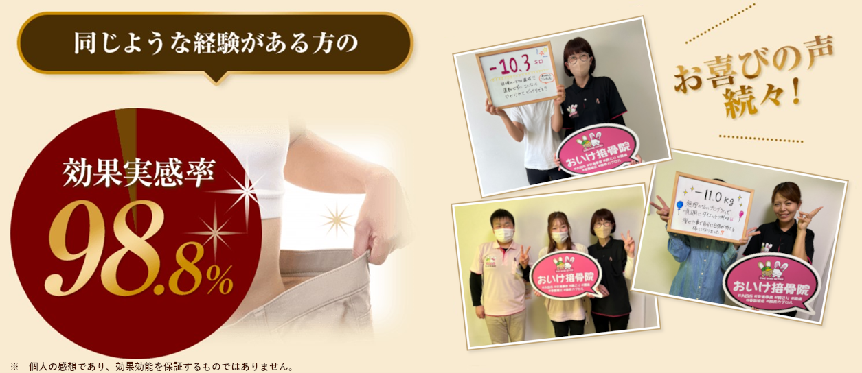 つまり、あなた自身の遺伝子に合わせたアプローチ法を見つけだしてダイエットを始めるからこそ、おいけ美容整体院では圧倒的なダイエットの成功率を叩き出していけるのです!