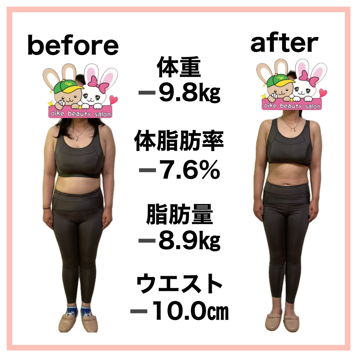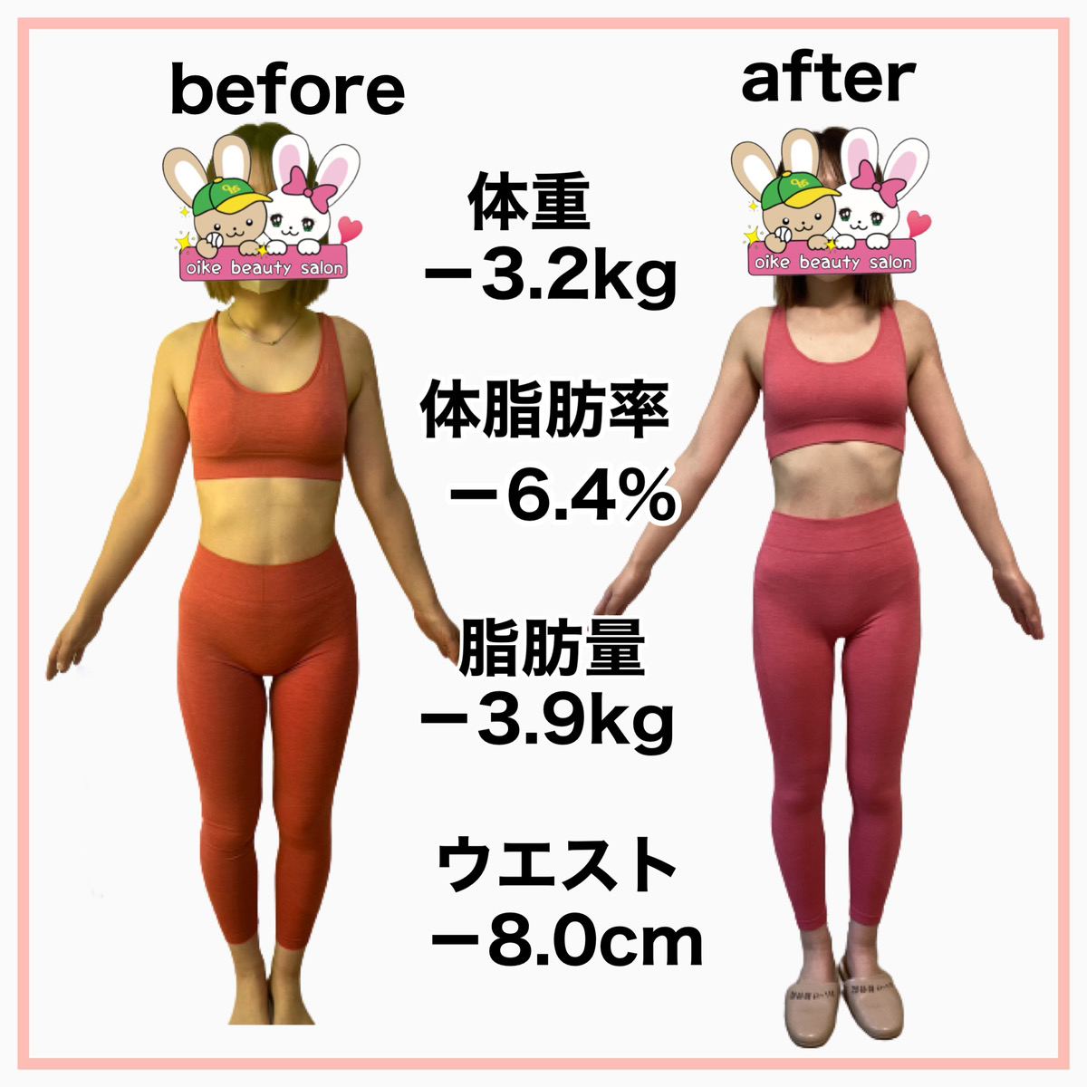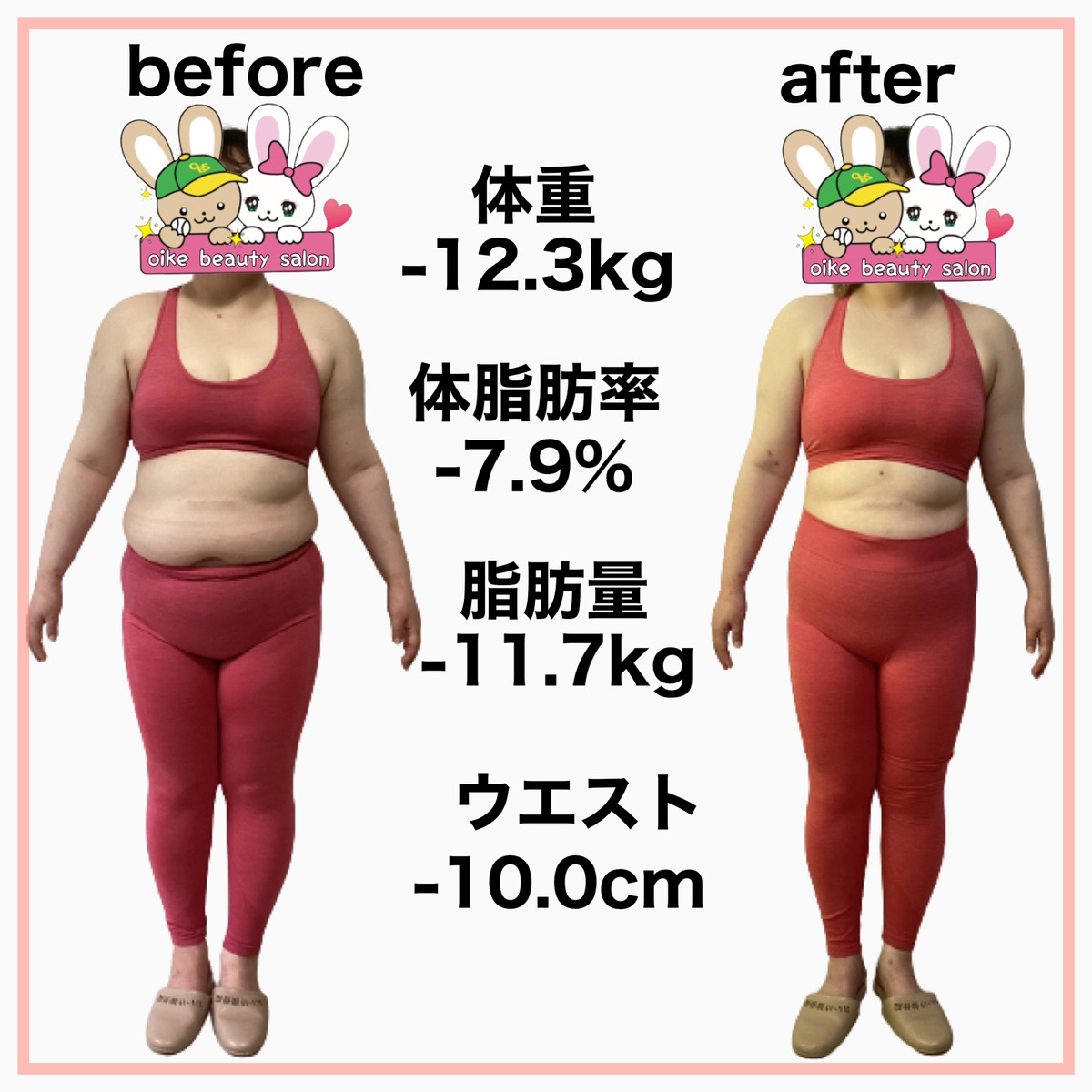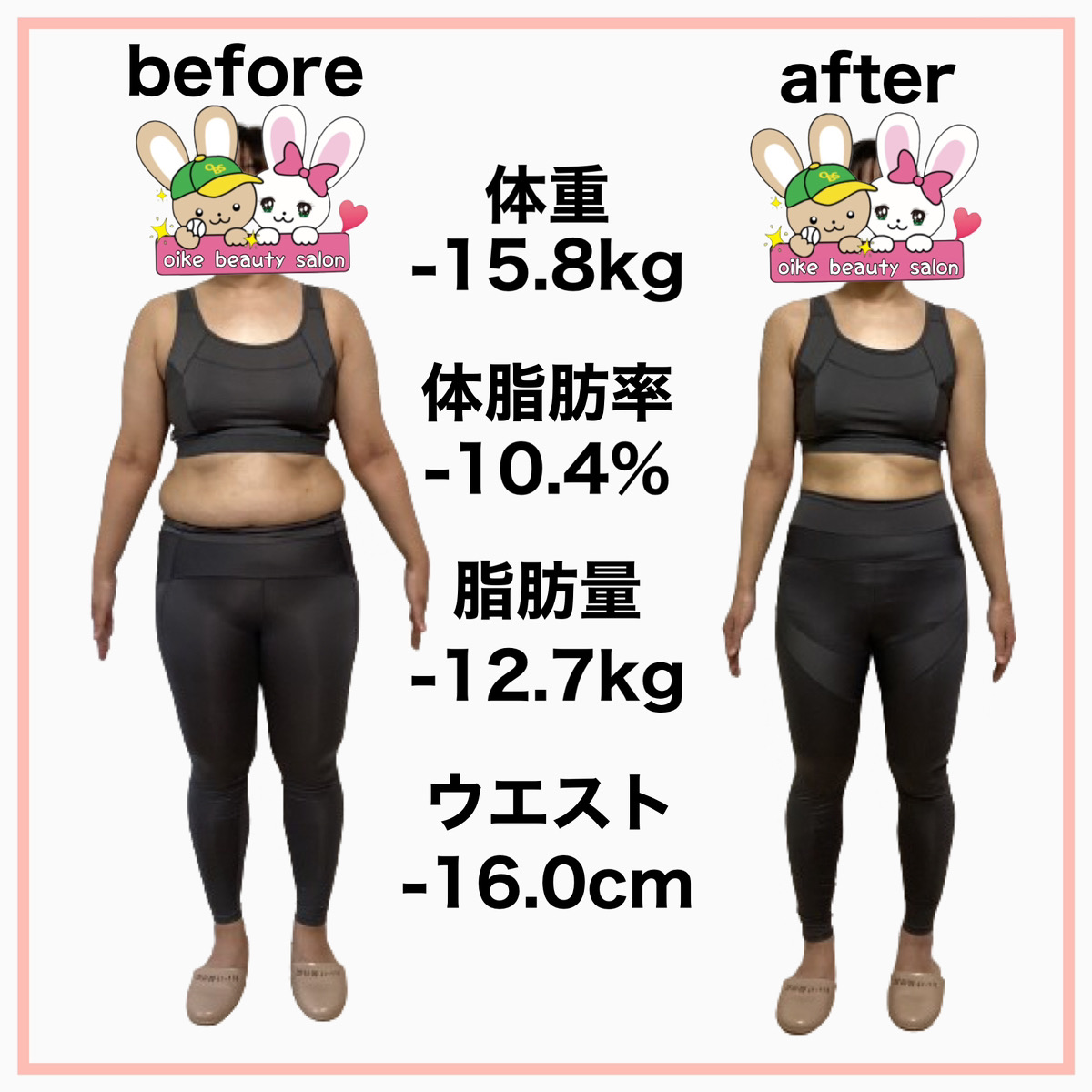 そんな時、おいけ美容整体院のダイエットの導入が決まり専門の知識を学び遺伝子検査で自分の食事へのリスクを知り、何を食べたら太りやすくなり何を食べたら太りにくいのか?を実践すると定期的に体重が落ちる様になりました。