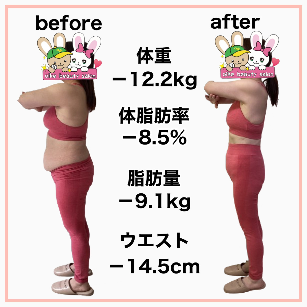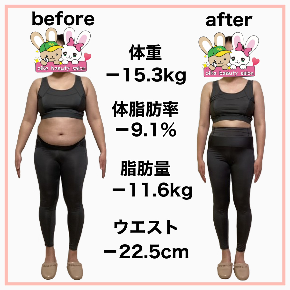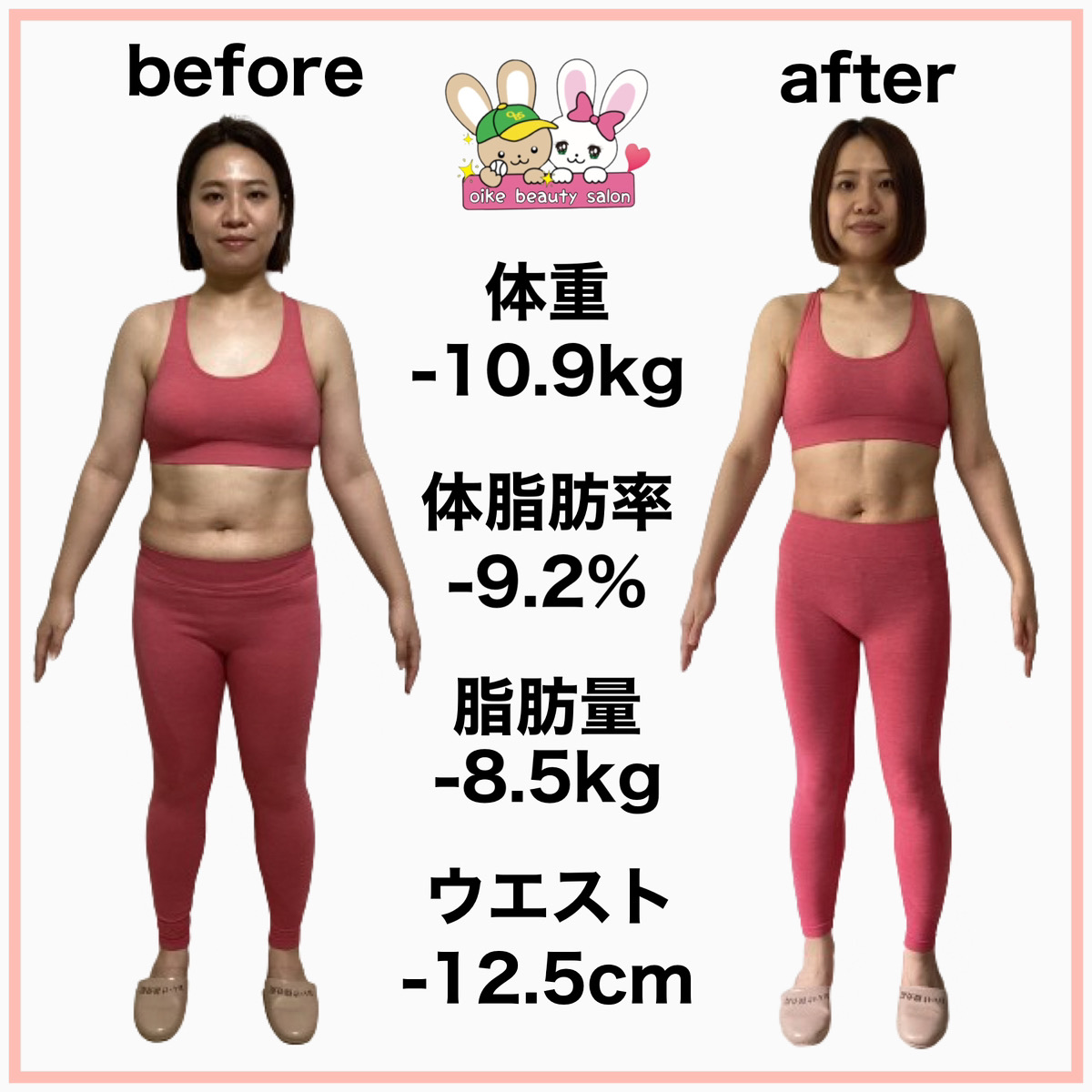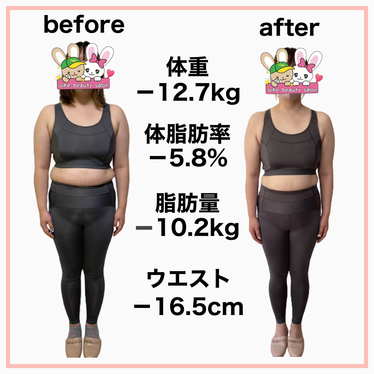 そんな時、おいけ美容整体院のダイエットの導入が決まり専門の知識を学び遺伝子検査で自分の食事へのリスクを知り、何を食べたら太りやすくなり何を食べたら太りにくいのか?を実践すると定期的に体重が落ちる様になりました。